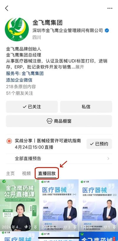 往期直播培训课程支持回放,关注“金飞鹰药械咨询服务”视频号并点击视频号主页,即可查看“直播回放”哦~