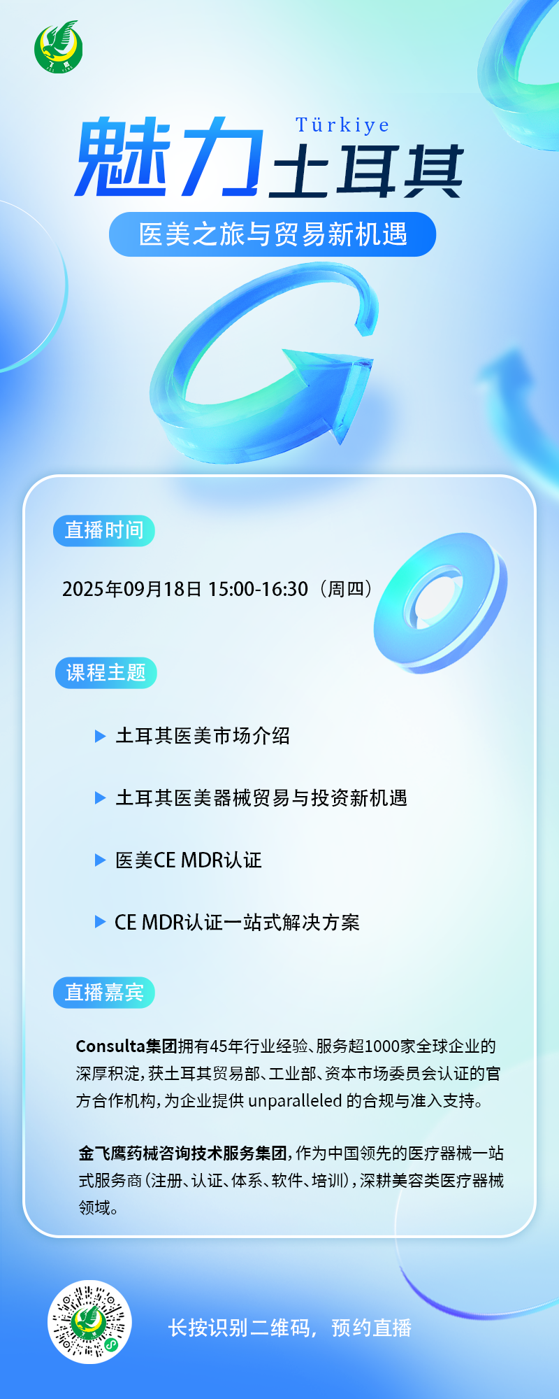 2025年9月18日(周四)下午15:00,金飞鹰药械咨询技术服务集团将携手土耳其Natural Clinic、Consulta Group、Investo Global等多家战略合作伙伴,联合举办“魅力土耳其:双轨掘金——医美之旅与贸易新机遇”线上分享交流会,为您全面揭开土耳其市场的无限潜力!